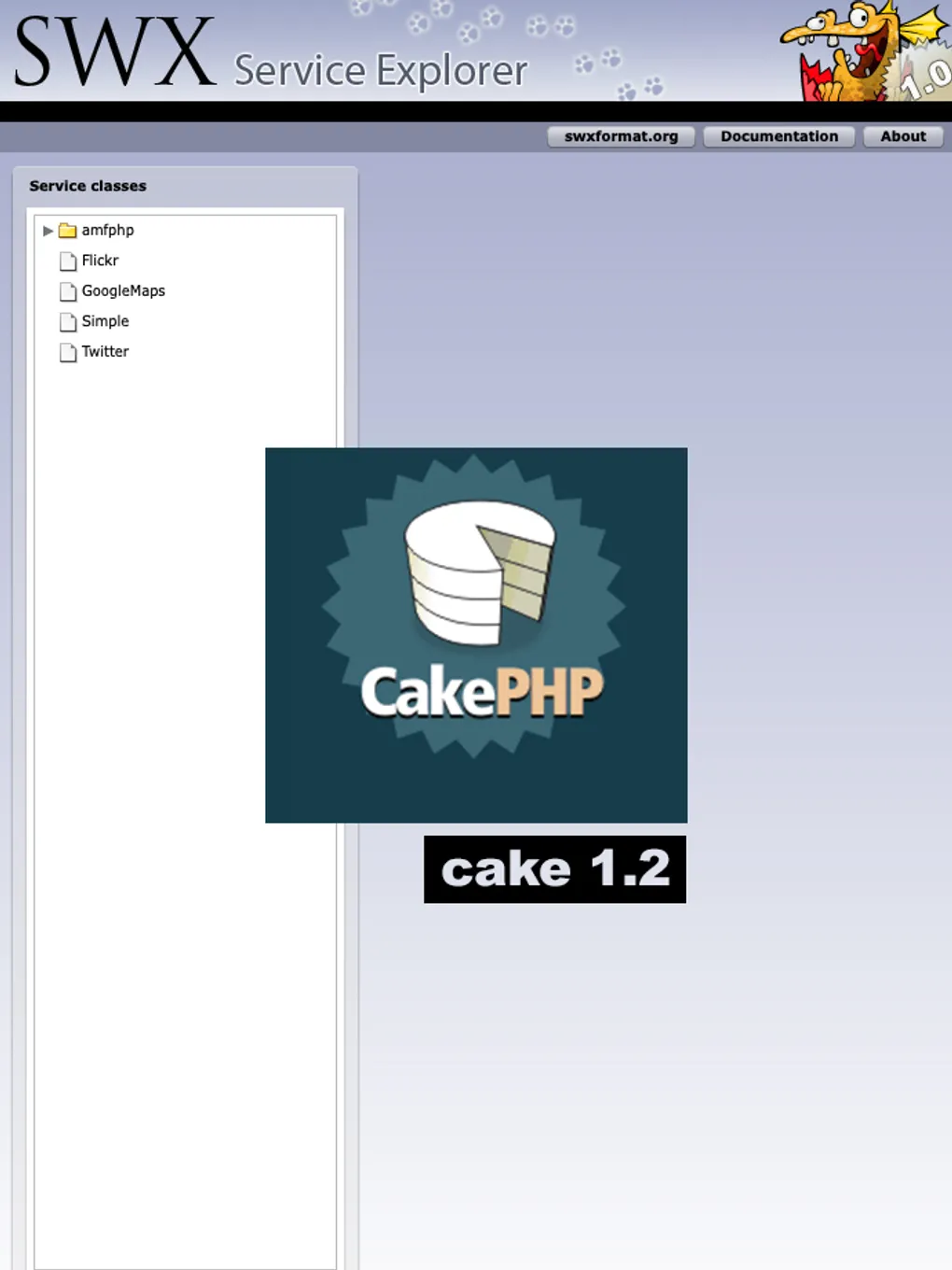 After some user input, I updated the cakeswxphp packages. I also started a branch which supports cakephp 1.2. There is a change in the gateway locations: you no longer connect to cake_swx_gateway.php or cake_amf_gateway.php, but to swx.php and amf.php (default locations in swx). This should make it even simpler to start with (cake)swx!
