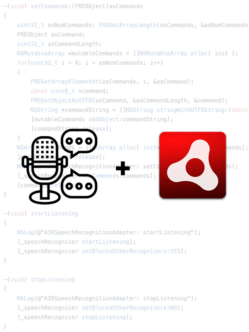 Today I played around a bit with speech recognition on OSX. One of the things I did, was create a simple bridge between Adobe AIR and the NSSpeechRecognizer API on OSX. This api allows you to set a predefined list of commands, and listen for those spoken commands.